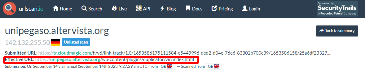 When you hover over the button in the email you are presented with the link above. But this doesn't really help that much. Performing some analysis using urlscan.io it is possible to see that this URL actually points to somewhere completely different hosted by alterVista.
