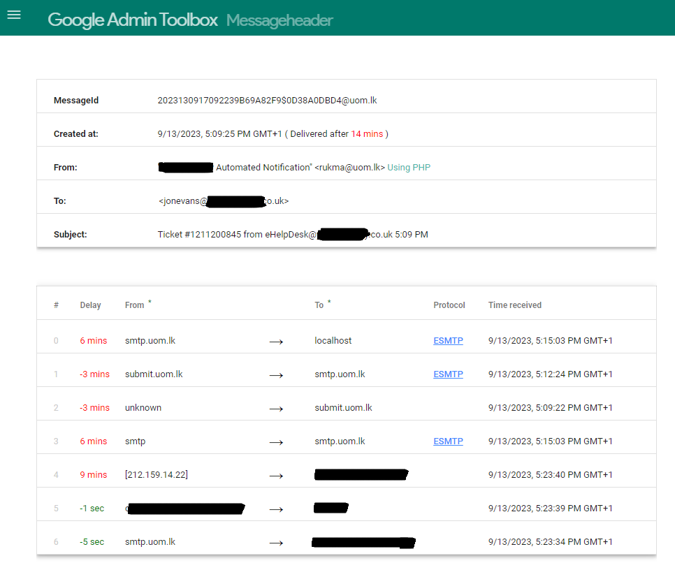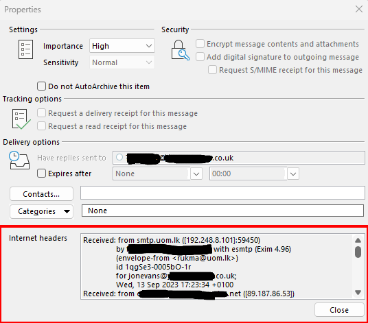 Once you have selected the contents of the 'Internet Headers' (CTRL+a followed by CTRL + c) you can then paste it into a suitable header analyser. IT Security Locksmith use various systems for analysis, one of which is the Google Admin Toolbox Messageheader.